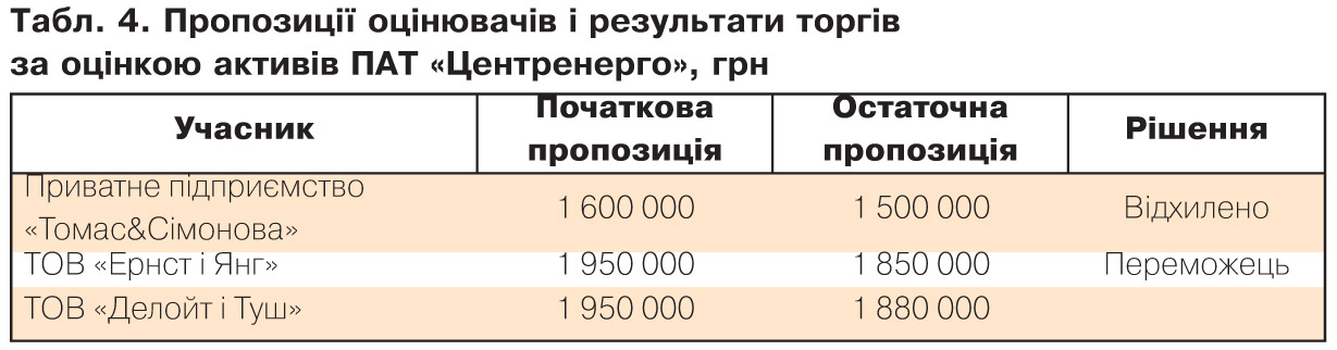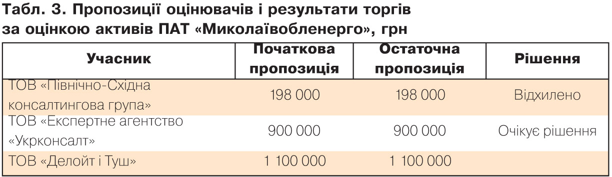 Інший цікавий тендер - щодо оцінки активів ПАТ "Миколаївобленерго", у якому взяли участь три компанії, дві з яких не входять до горезвісної "четвірки" (див. табл. 3). Як бачимо, тут узагалі ніхто не торгувався, і спочатку пропозицію компанії з найнижчою ціною було відхилено, але після подачі пояснень цією компанією тендерний комітет цілком справедливо змінив своє рішення і в результаті оголосив переможцем учасника з найнижчою ціною, яка виявилася в шість (!) разів нижчою від ціни, запропонованої ТОВ "Делойт і Туш".