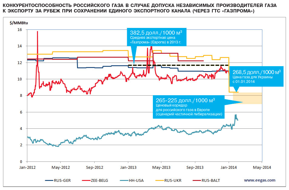 Визначений оптимальний коридор для експортної ціни - 265–225 дол. за тисячу кубометрів (середня ціна європейських поставок "Газпрому" в 2013 р. становила 382,5 дол. за тисячу кубометрів, або 11,9 дол./Mmbtu), що зробить російський газ більш конкурентоспроможним на ринку ЄС, у тому числі на спотовому ринку. Також, за оцінкою експертів, основним позитивним ефектом для держави і фактором, який забезпечує виграшну (win-win) ситуацію для всіх зацікавлених сторін, є додатковий обсяг експорту, який обкладається митом. За задумом "Сколково", знижувальний ціновий маневр дозволить РФ перемогти у війні за частку на ринку ЄС, який вона динамічно втрачала після 2008 р., а також збільшити надходження до бюджету.