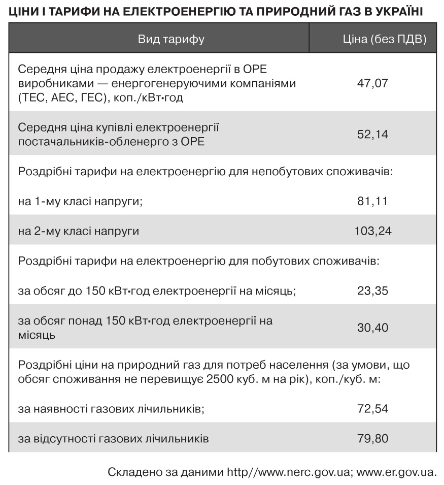 Однак повернімося до питання, яке безпосередньо стосується кожного домогосподарства, а саме - до цін на електроенергію, природний газ, тепло- та водопостачання для населення. Внаслідок адміністративного "регулювання" сформувалася викривлена тарифна система (див. табл.). Для населення тарифи на електроенергію майже вдвічі менші, ніж для решти споживачів, і забезпечують відшкодування лише близько 30% собівартості на рівні 3 центів США за кіловат-годину. Цінова диспропорція призводить до перекладання витрат на транспортування і розподіл електроенергії з побутових споживачів на промислових. Як свідчить досвід багатьох європейських країн, тарифи на електроенергію для населення зазвичай перевищують промислові щонайменше на 40%, оскільки витрати на постачання енергії для великих споживачів значно менші. У середньому по ЄС таке перевищення становить до 50%. Звісно, що різниця у доходах не дозволить миттєво досягти такої пропорції в Україні.