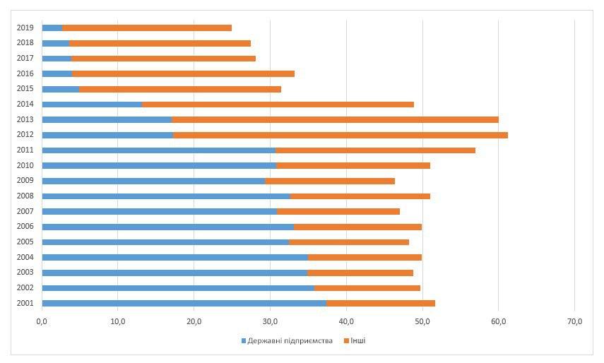 Динаміка видобутку енергетичного вугілля у розрізі форм власності підприємств, 2001–2019 рр., млн т