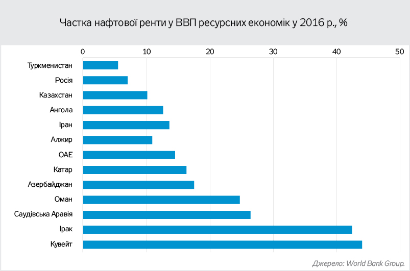 Доходи від нафтогазового сектора у країнах - найбільших експортерах становлять левову частку ВВП. Частка нафтової ренти у ВВП основних ресурсних економік коливається залежно від цін на нафту, але навіть за низьких цін (у 2016 р.) залишалася достатньо значною (див. рис.). У Росії нафтові доходи у період найвищих цін (перша декада нинішнього століття) становили близько половини ВВП. Для цієї країни спостерігається майже повна кореляція між динамікою ВВП і світовими цінами на нафту.
