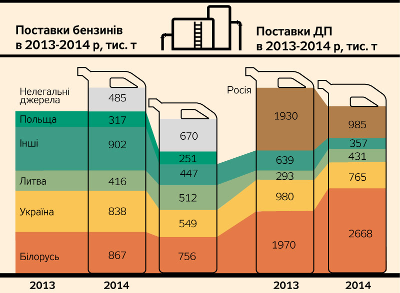 2014-го ринок нафтопродуктів пережив революцію разом з усією країною. І так само, як уся країна, з одного важкого стану перейшов в інший. На зміну задушливим схемам "кривавого режиму" прийшла економічна криза, а з нею підвищення податків і падіння споживання. Конкуренція між постачальниками та напрямками поставок посилилася, але всі вони знову опинилися перед проблемою протистояння з тіньовим ринком. І якщо раніше превалювала контрабанда, то нині проблема перемістилася на нелегальні виробництва всередині країни.