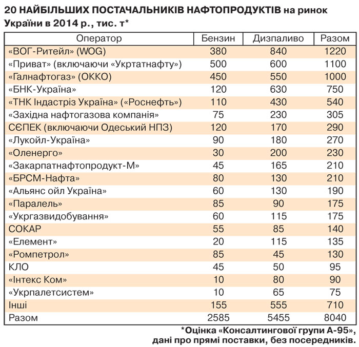 Паливний ринок України залишається дуже диверсифікованим і висококонкурентним. Така модель знімає з порядку денного побоювання щодо можливої блокади з боку Росії, яка прямо поставляє хоча й небагато, але має важелі впливу на Білорусь - найбільшого постачальника нафтопродуктів в Україну. Потужностей морських портів і сухопутних коридорів і пропозиції палива будь-яких марок цілком достатньо. Основні проблеми пов'язано з кризою споживання та зростанням тіньового ринку, що з однаковою силою б'є як по ринку, так і по держскарбниці. 2015-го ринок продовжить звужуватися - розбухлих від податків і девальвації цінників на АЗС споживачу не потягнути.