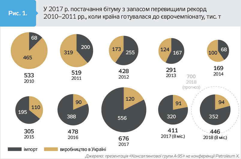 Подібний розвиток транспортної та зберігальної інфраструктури пов'язаний і зі зміною джерел поставок бітуму. Якщо 2010-го українські НПЗ забезпечили 87% поставок бітуму, то у 2017–2018 роках - трохи більш як 20%. До 2012 року потужним виробником якісних дорожніх бітумів був Лисичанський НПЗ компанії ТНК-ВР, який за сукупністю чинників не має перспектив відновити роботу.