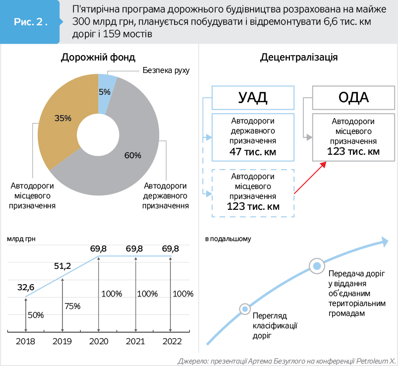 Щоправда, Мінфін наполіг на поетапному збільшенні фонду: 2018 року це 50% акцизу, або близько 32,6 млрд грн, 2019-го - 75% (51,2 млрд) і з 2020-го - всі 100%, або близько 70 млрд грн щорічно аж до 2022-го. Таким чином п'ятирічна програма дорожнього будівництва розрахована на майже 300 млрд грн, за які планується побудувати і відремонтувати 6,6 тис. км доріг і 159 мостів (див. рис. 2).