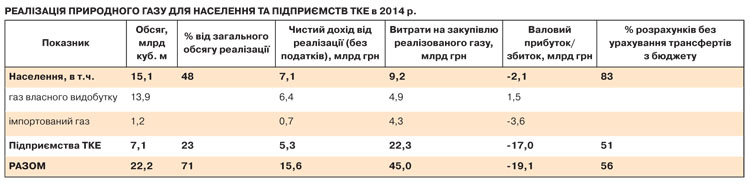 За перший квартал 2015-го збитки НАКа від продажу газу тепловикам, які виробляють тепло для населення, прогнозуються в розмірі 20,6 млрд грн (3,3 млрд куб. м х (710 грн/тис. куб. м - 320 дол. х 21,7 грн/дол.)=20,6 млрд грн). При цьому аналогічні збитки за перший квартал 2014 р. становили