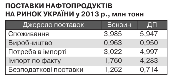 Виходячи з діючих ставок податків на нафтопродукти (акцизів і ПДВ), 2013-го Міндоходів недоодержало близько 5,245 млрд грн податків з бензину та 1,713 млрд грн - з дизельного палива.