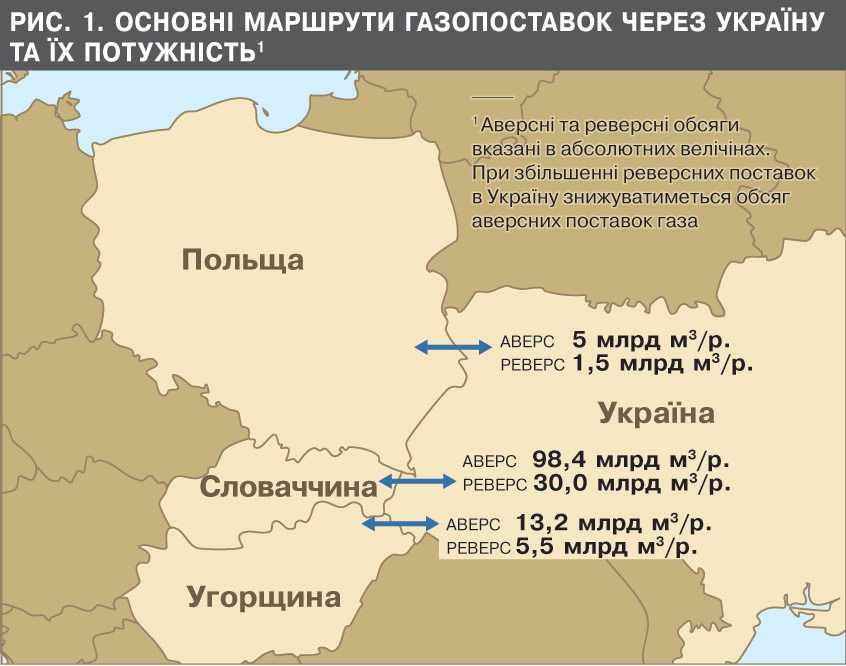 "Ми просимо не віртуальний, а реальний реверс, але на рівних з усіма умовах", - заявив А.Коболєв. По суті, варіант, на якому наполягає Україна, дозволяє одержати через ГТС Словаччини доступ до європейського ринку, обсяг якого непорівнянний із нинішніми реверсними струмочками в Україну, і реверс може становити до 30 млрд кубометрів газу на рік (див. рис. 1). Причому за обопільної згоди сторін цей варіант можна реалізувати протягом кількох тижнів.