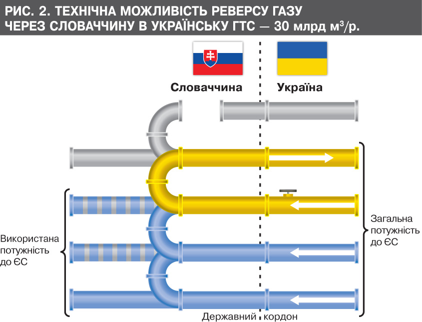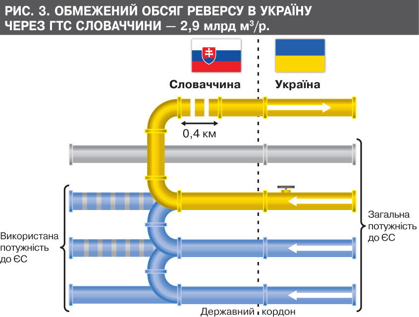 Як нагадав глава "Нафтогазу" А.Коболєв, у 2011 р. саме Словаччина пропонувала варіант, як саме Україна може одержувати газ зі Словаччини по реверсній системі. Але тепер вона не погоджується на такий варіант, оскільки напрямок газу контролює "Газпром". Словаччина готова забезпечити реверс в Україну лише 2,9 млрд кубометрів газу на рік (див. рис. 3). Для цього вона пропонує добудувати 300–400 м газопроводу, який нині не використовується. І словаки розраховують, імовірно, що оплатить це будівництво якщо не Україна, то ЄС. Цю умову, за інформацією DT.UA, було внесено в Меморандум про взаєморозуміння. Там зазначено і терміни будівництва, й інші процедури. А сам газомаршрут мав почати працювати вже в жовтні 2014 р.