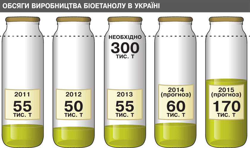 Україна споживає на рік близько 5 млн т бензинів, тобто для переходу на "спиртовмісне" пальне необхідно 250 тис. т біоетанолу. Водночас у 2012–2013 рр. виробництво цього компонента в країні не перевищує