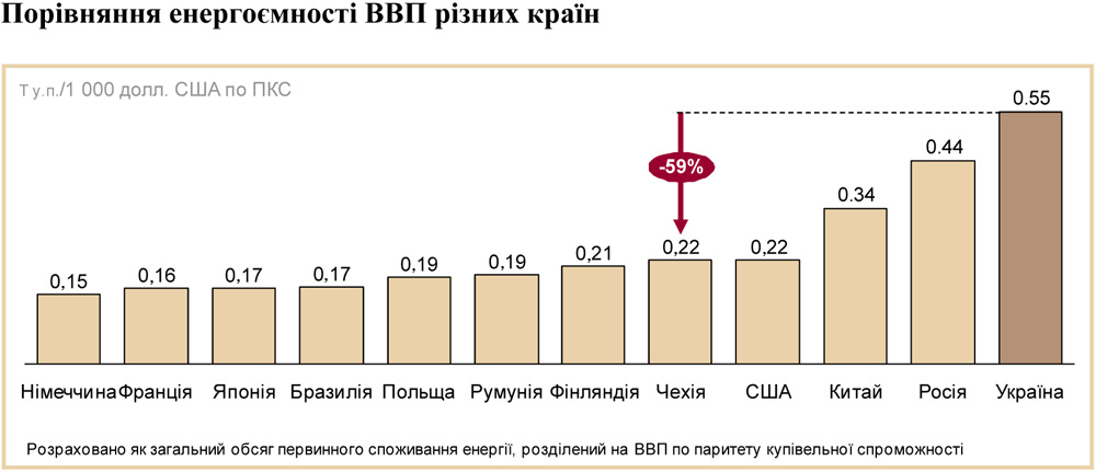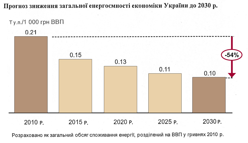 - впровадження комплексних програм підвищення енергоефективності зі зниженням споживання енергоресурсів в економіці на 30–35% до 2030 р., що істотно зменшить навантаження на економіку, підвищить енергонезалежність держави та конкурентність її ВВП.