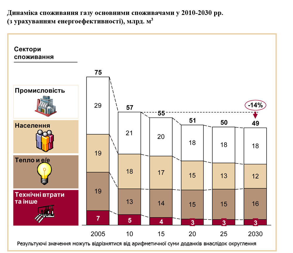 Очікується, що загальний обсяг газоспоживання до 2030 р. становитиме близько 49 млрд кубометрів при базовому сценарії (при оптимістичному - 53 млрд, це як у 2010 р., при песимістичному - 47 млрд). Це з урахуванням повномасштабного впровадження енергозберігаючих технологій, про які у стратегії власне сказано досить нечітко. Промисловість споживатиме 18, а населення - 12 млрд кубометрів. Хоча й наголошується, що внутрішня структура газоспоживання практично не зміниться. Виходить, одна надія, що люди почнуть або ж їх змусять заощаджувати газ.