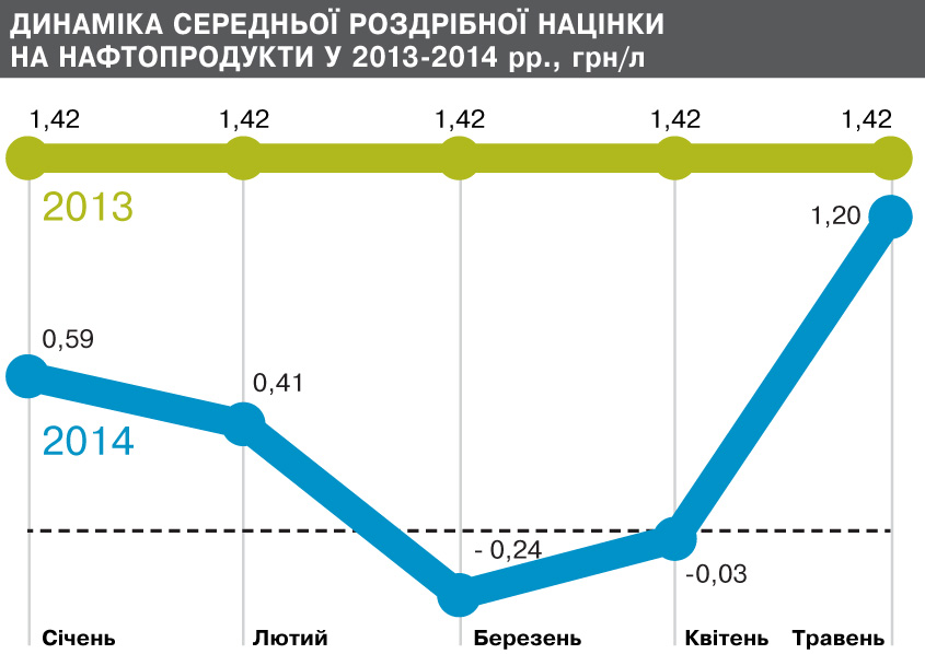 24 коп. на літрі, у квітні торгували без націнки. У зв'язку з цим падіння обсягів продажів у квітні можна вважати досить вдалою обставиною. При цьому відсутність націнки не означає відсутності збитків: зарплат, експлуатаційних витрат, податків та інших обов'язкових платежів ніхто не скасовував. Якщо врахувати, що ці витрати сумарно становлять 0,8–1,0 грн/л, то цього року прибутку ще ніхто не бачив. І побачить нескоро.