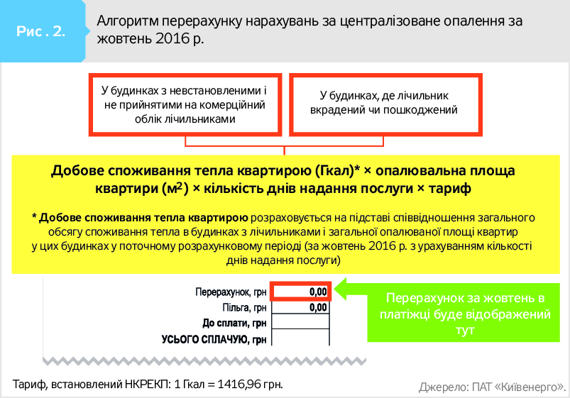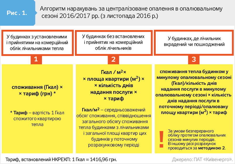 На рис. 1 представлено алгоритм нарахувань плати за теплоенергію в будинках з лічильниками тепла, без лічильників і будинках з пошкодженими або вкраденими приладами обліку тепла. Тариф за 1 Гкал, затверджений НКРЕКП з жовтня 2016 р., становить 1416,96 грн. Згідно з цим механізмом, описаним для кожної з трьох згаданих категорій будинків, і за таким тарифом нараховувалася плата за теплоенергію з листопада попереднього року.