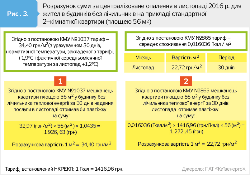 Що ж стосується нарахувань із листопада 2016-го, поданих на рис. 3, то на прикладі стандартної двокімнатної квартири загальною площею 56 кв. м наочно показано різницю розрахунків вартості опалення 1 кв. м, яка після введення в дію постанови уряду №865 від 9 грудня 2016 р. скоротилася з 34,40 грн до 22,72 грн за 1 кв. м.