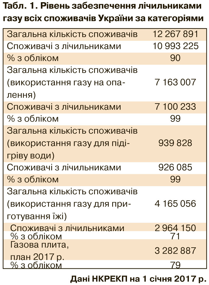 З домогосподарствами, як приватними будинками, так і багатоповерховими, набагато складніше, та й клопоту більше. По-перше, тому що їх у тисячі разів більше. По-друге, попри те, що за останні роки громадян переконували та примусово стимулювали, зокрема ціною на газ, установити прилади обліку газу, рівень забезпечення ними домогосподарств становить 71%. Про це свідчать дані Національного регулятора (НКРЕКП) станом на початок 2017 р. (див. табл. 1). Можна в цьому дорікати приватизованим облгазам, які з різних причин не потрудилися або не були зацікавлені в належному обліку не тільки поставок, а й споживання газу. Але факт залишається фактом - на проголошений урядом 100-відсотковий облік газу до початку 2018 р. розраховувати не доводиться.