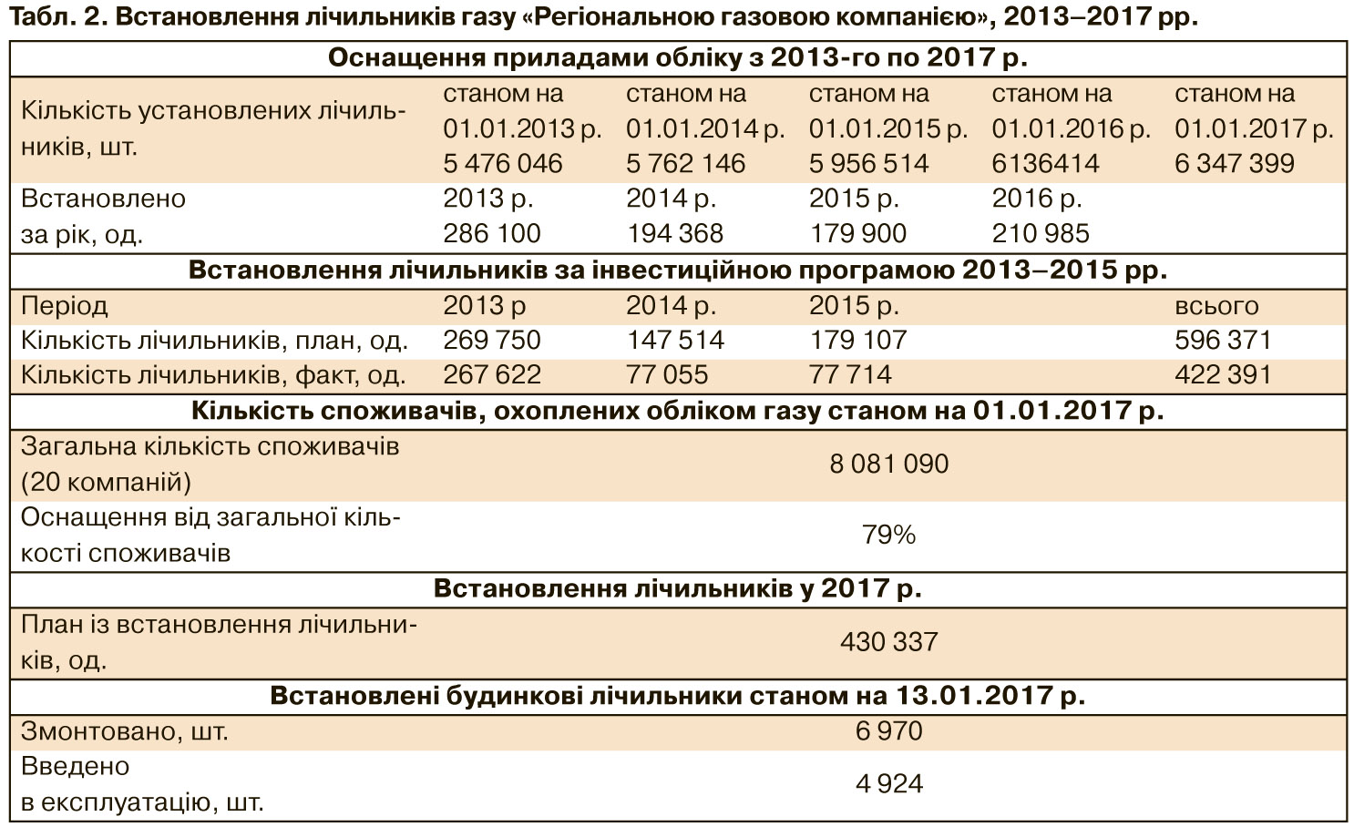 Однак у 2017 р., наприклад, у рамках групи компаній РГК ("Регіональна газова компанія", до якої входять два десятки найбільших міськ- і облгазів України, які належать Дмитру Фірташу та партнерам) держрегулятор затвердив встановлення 430 337 лічильників газу (див. табл. 2). РГК пов'язує це з рівнем нинішніх тарифів, який не забезпечує достатнього надходження коштів на закупівлю потрібної кількості лічильників.
