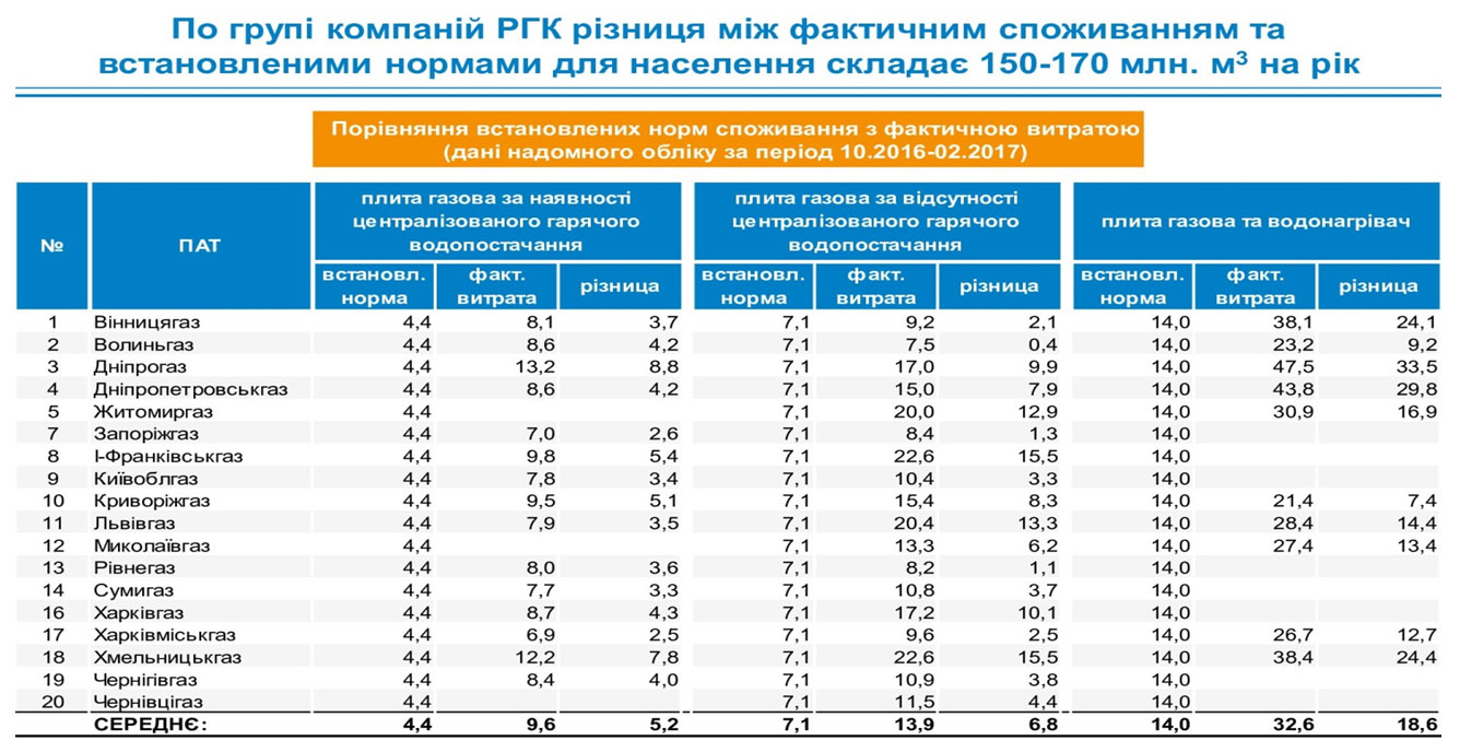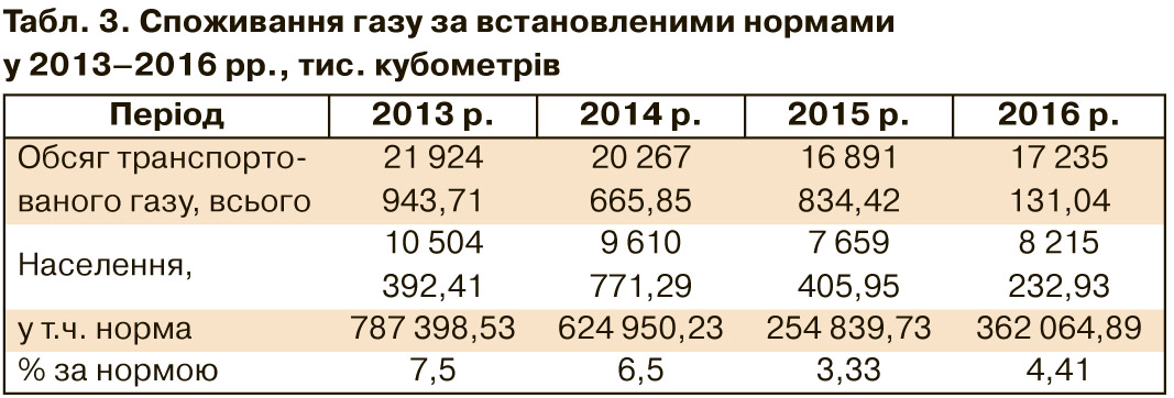 Проблема споживання газу за нормами дуже політизована й найчастіше перебільшена. Газівники неодноразово заявляли про те, що діючі норми не відповідають реальному споживанню, що підтверджують не тільки їхні розрахунки, а й дослідження USAID. На прикладі групи компаній РГК очевидно, що за 2016 р. частка спожитого газу без приладів обліку становила лише 4,4% (див. табл. 3). Порівняно з 2013 р. на початок нинішнього року ця частка скоротилася в 1,7 разу (становила 7,5%), за цей самий час установлені норми в кілька етапів було знижено в 1,5 разу. За чотири роки (2013–2016 рр.) споживання газу без лічильників по групі компаній РГК зменшилося у 2,2 разу й становило торік 362 млн кубометрів (див. табл. на сайті ZN.UA).