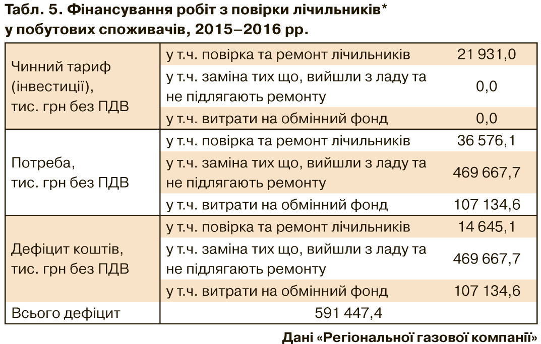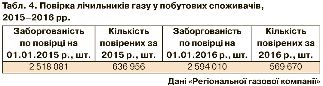 Через дефіцит коштів у тарифі на початок 2015 р. не було проведено своєчасну повірку 2 518 081 лічильників газу (див. табл. 4). Через рік, на початок 2016 р., попри те, що було проведено повірку майже 570 тис. приладів, цей показник збільшився до 2 594 010.