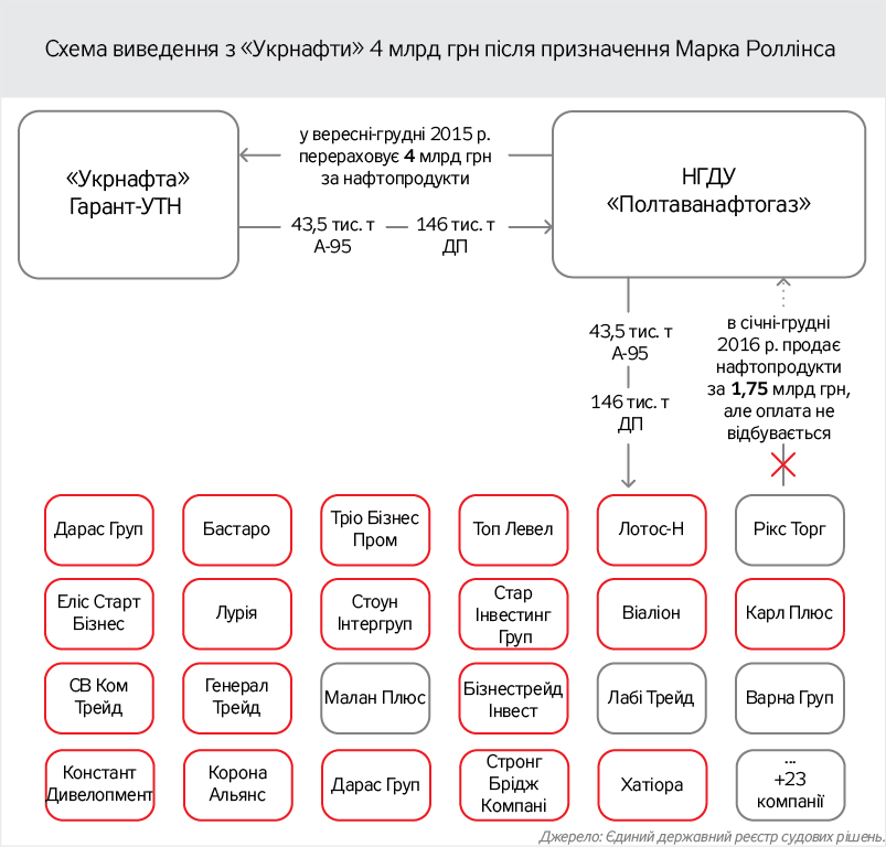 Однією зі схем термінового виведення коштів навесні-влітку 2015 р. стала купівля "Укрнафтою" величезних обсягів нафтопродуктів, яких, звісно, так ніхто й не поставив. Здавалося, проїхали… Але саме цю примітивну двоходівку було першою реалізовано наприкінці 2015-го, коли Роллінс уже ораторствував на Кабміні й у парламенті про незворотність реформ у нафтовій компанії.