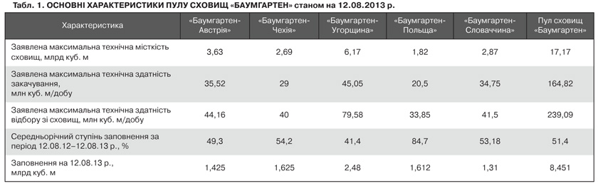 Наведені табл. 1 і рис. 1, 2 свідчать, що параметри окремих сховищ, які входять до пулу "Баумгартен", поступаються українським ПСГ. Однак разом пул центральноєвропейських сховищ майже порівнянний з потужностями західноукраїнських ПСГ.