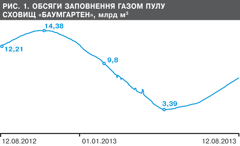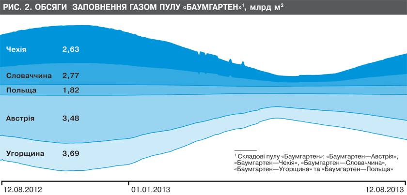 За останній рік (з 12 серпня 2012 р. по 12 серпня 2013 р.) максимальна завантаженість ПСГ, які ми розглядаємо, становила: Австрії - 95,87% (від максимально можливої технічної місткості), Чехії - 97,77, Угорщини - 59,81, Польщі - 100 і Словаччини - 96,52%. Для всього пулу ПСГ "Баумгартен" - 83,75%.