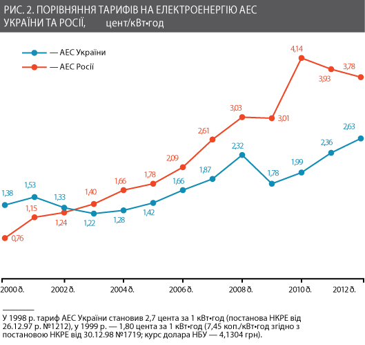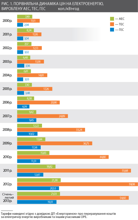 У період з 2000-го по 2012 р. середньорічні тарифи для різних видів генерації неухильно зростали. Цікава динаміка цього зростання: якщо для АЕС тарифи за цей час збільшилися у 2,8 разу, то для ТЕС - у 5,3 разу. Навіть для ГЕС, які використовують як енергоресурс воду (тобто не витрачають, як у випадку ТЕС, понад 70% від тарифу на купівлю енергоносіїв, або АЕС - близько 25% на закупівлю свіжого ядерного палива), тариф зріс у 6,56 разу (див. рис. 1).