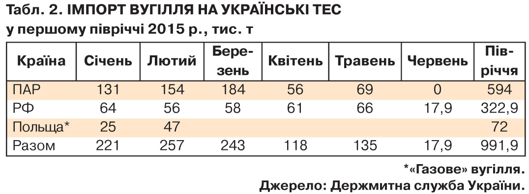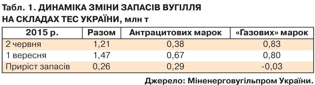На 27 серпня 2015 запаси вугілля на складах теплових електрогенеруючих компаній становили тільки 1,35 млн т (див. табл. 1.). Це на чверть менше навіть від абсолютно провального в усіх сенсах рівня минулого року. Про 4 млн т, накопичених на аналогічний період у 2012–2013 рр., ніхто вже не згадує (і на те є чимало причин). За минуле літо не змогли приростити запаси вугілля навіть на 300 тис. т (раніше за один літній місяць накопичували до мільйона тонн вугілля).