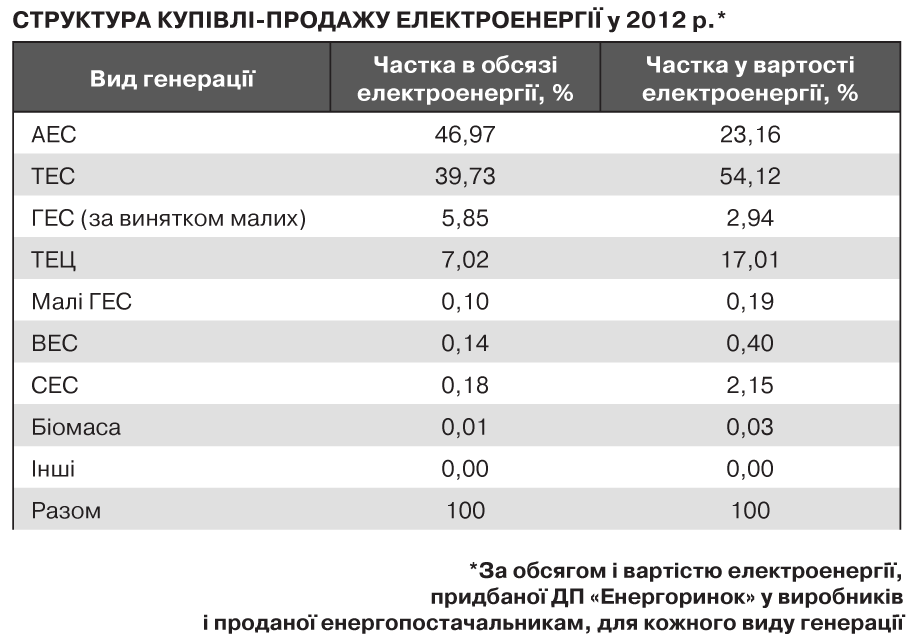 Якщо подивитися на структуру виробництва електроенергії за підсумками 2012 р., то електроенергія, вироблена на АЕС, становила 47% від усієї виробленої в країні. При цьому її частка в структурі середньооптової ціни - 23%. На електроенергію, вироблену на ТЕС, припало близько 40% від усього обсягу, однак її вартість дорівнювала 54% середньооптової ціни (див. табл.).