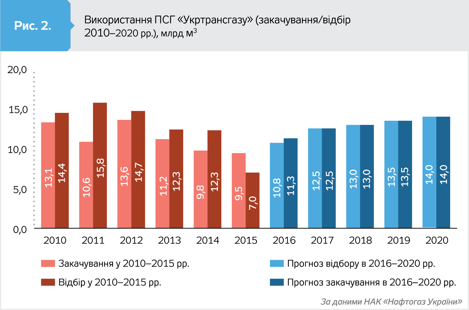 Для стабілізації сезонної нерівномірності споживання газу використовуються 11 підземних сховищ газу, вітчизняна мережа яких є однією з найпотужніших в Європі (одне сховище в анексованому Криму і одне в зоні АТО зараз не контролюються і не використовуються). Загальна активна місткість ПСГ становить 31 млрд кубометрів.