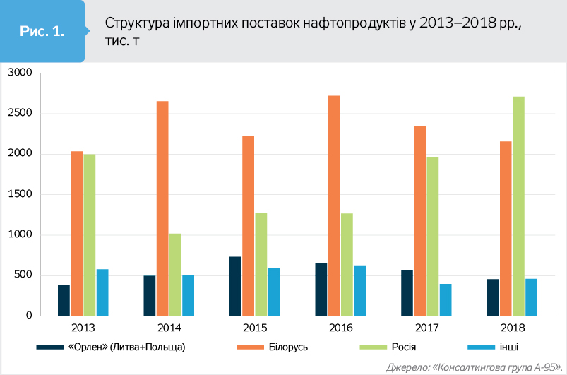 За підсумками 2018 р., 75% поставок дизельного палива, наймасовіше споживаного моторного палива в Україні, припало на Росію (42%) і Білорусь (33%) (див. рис. 1). Настільки значна частка поставок з країн Євразійського союзу спостерігається вже давно, змінюються лише пропорції. Наприклад, на початку 2016-го, коли діяло ембарго на поставки з Росії, частка білоруського імпорту в національному балансі становила 80%.
