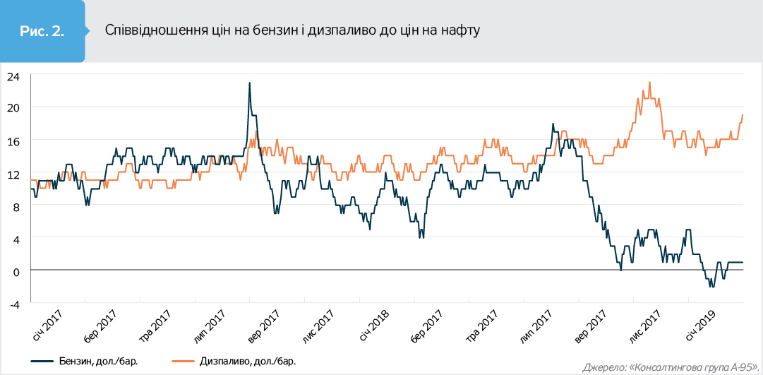 Процес пішов, і він уже тут. З другої половини 2018-го ціни на дизпаливо й бензин А-95 на українських АЗС зрівнялися. Причина - зростання цін на дизпаливо у світі як наслідок високого попиту (див. рис. 2). Поза сумнівом, дизпаливо дорожчатиме й надалі, це пророкують на будь-якій міжнародній "нафтовій" конференції.