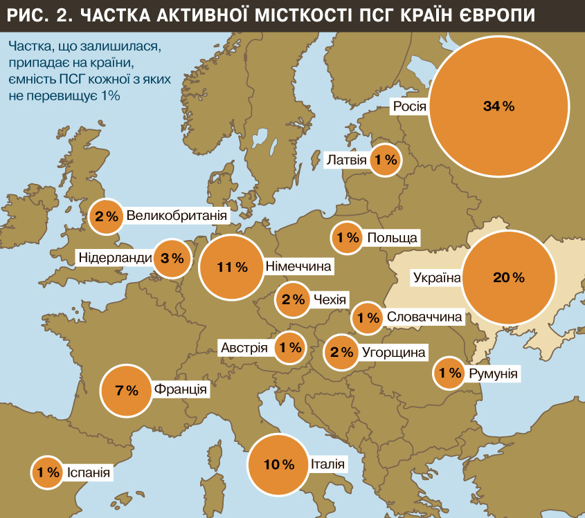 На сьогодні більші запаси газу в ПСГ Європи має лише Німеччина, де зберігається близько 20,1 млрд кубометрів. На третьому місці - Італія, в сховищах якої накопичено близько 15,6 млрд кубометрів.