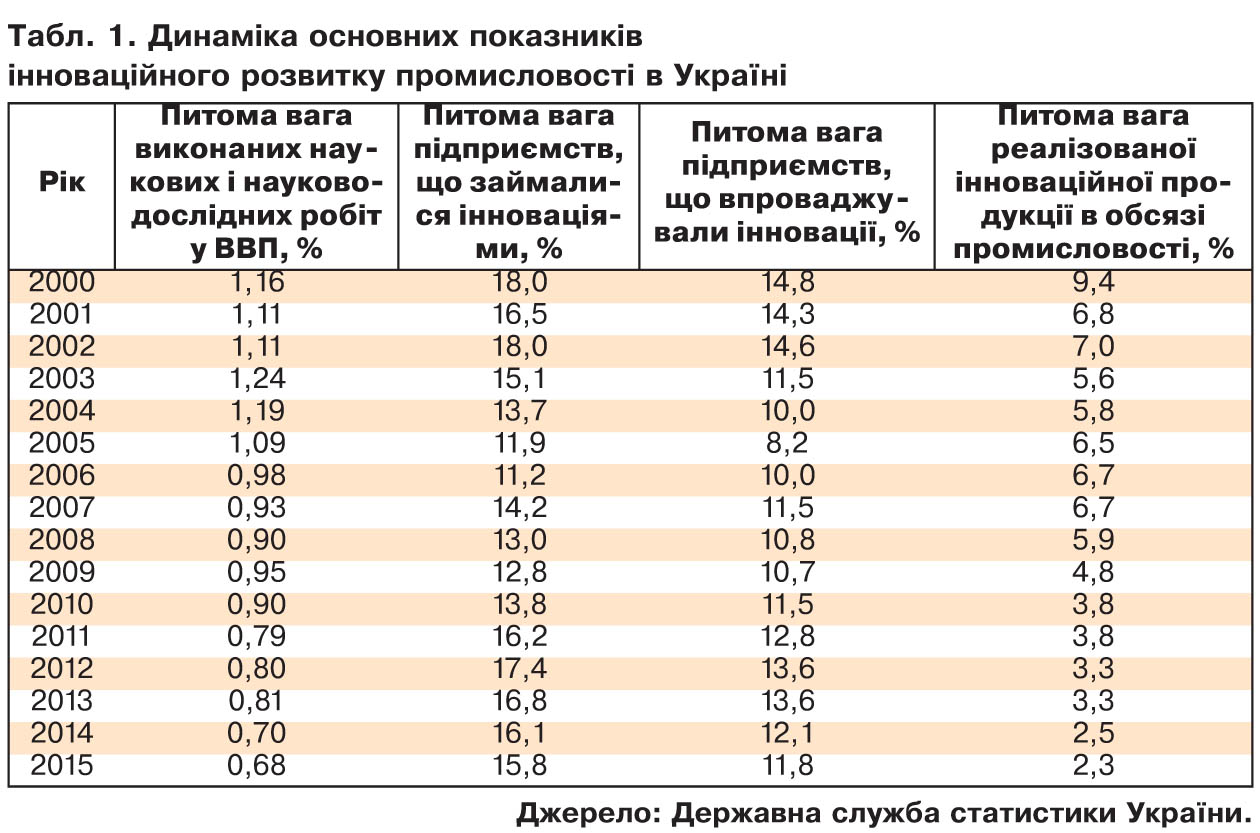Водночас, за даними Державної служби статистики, питома вага виконаних наукових і науково-дослідних робіт у ВВП дорівнювала у 2015 р. 0,68%. Частка інноваційно активних промислових підприємств у країні скоротілася і становила
