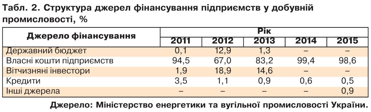 Стратегія інноваційного розвитку вугільної галузі формується, як правило, за участі підприємств. За даними Міненерговугільпрому, у 2015 р. у структурі джерел фінансування підприємств добувної промисловості частка власних коштів досягнула 98,6%, на кредити ж припадало 0,5%, інші джерела - 0,9%.