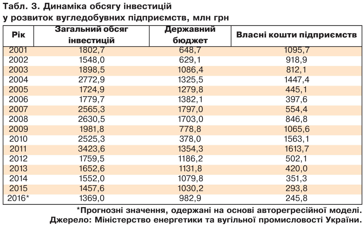 Якщо й у подальшому зберігатиметься така ситуація, то, за розрахунками фахівців відділу проблем перспективного розвитку паливно-енергетичного комплексу Інституту економіки промисловості НАН України на основі використання авторегресійної моделі, прогнозні значення загального обсягу інвестування інноваційного розвитку вугільної галузі в 2016 р. становитимуть 1369 млн грн, що на 24,1% менше порівняно з 2001 р. Це відбуватиметься за рахунок скорочення обсягів коштів держбюджету на 51,5% і власних коштів підприємств на 77,6% порівняно з 2001-м. Обсяги держфінансування прогнозуються на 2016 р. у розмірі 982,9 млн грн, а власних коштів підприємств - 245,8 млн.
