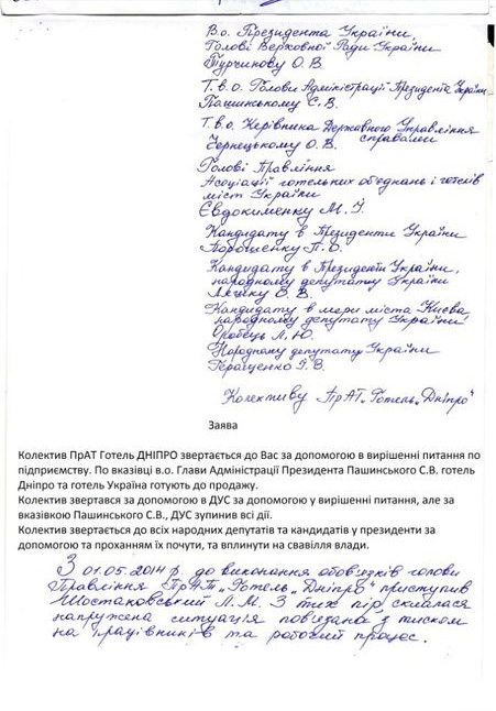 Трудовий колектив готельного комплексу "Дніпро" із закликом не дати довести підприємство до колапсу та з відповідною заявою звернувся до всіх вищих чиновників тимчасової влади, першими серед яких значаться в.о. президента О.Турчинов, в.о. голови АП С.Пашинський і тимчасовий керуючий ДУСі. Звернення адресоване також кільком кандидатам у президенти.