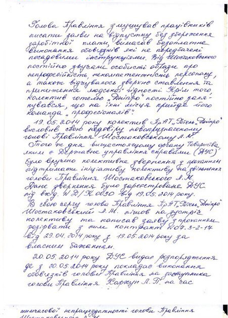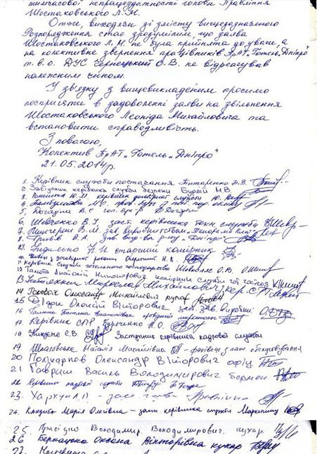 Дійшло до того, що 19 травня 2014 р. трудовий колектив готельного комплексу "Дніпро" висловив недовіру новопризначеному керівникові Шостаковському.
