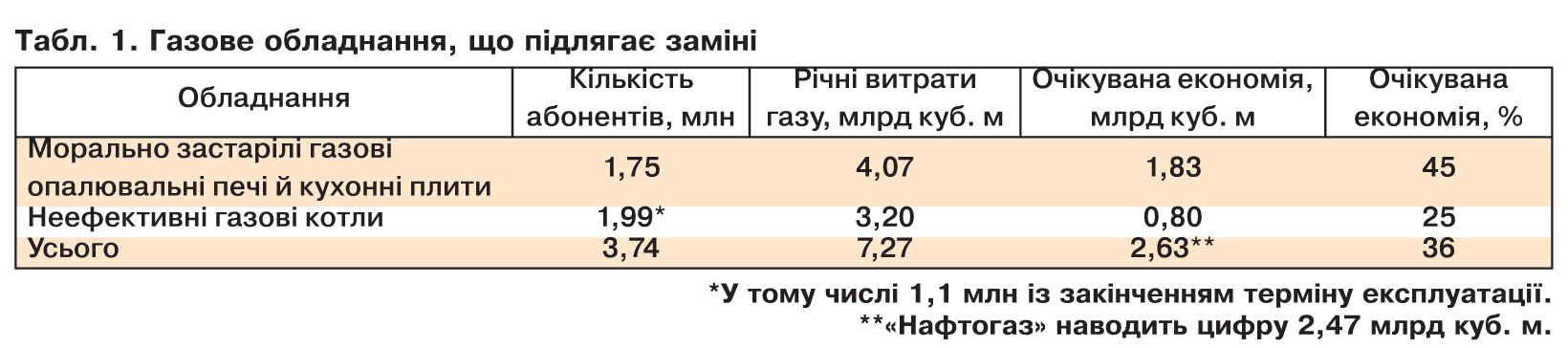 1,75 млн абонентів експлуатують "морально застарілі" газові печі й кухонні плити (із середнім споживанням 2325 кубометрів на рік). Ще у майже 2 млн абонентів установлено неефективні газові котли, причому в 1,1 млн закінчився термін експлуатації.
