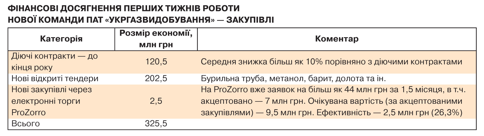 Інші перемоги можна розділити на дві групи. Одна з них - зміни в сфері закупівель, де досягнуто значних результатів: за кілька місяців компанія заощадила близько 320 млн грн. Такого значного ефекту досягнуто за рахунок зниження цін за існуючими контрактами (близько 120 млн грн), проведення нових відкритих тендерів (ефект близько 200 млн) і участі в державній системі закупівель ProZorro. Приклад нещодавнього нового тендера - закупівля бурильної труби, де брало участь 11 компаній, з них три китайські виробники. У результаті економія від колишніх цін закупівель становила 30–50%. Компанія також швидко ввійшла в п'ятірку лідерів із використання та економії на системі електронних закупівель ProZorro. Нині у системі від "Укргазвидобування" подано заявок на більш як 50 млн грн, а за закритими тендерами економія вже становить 2,1 млн.