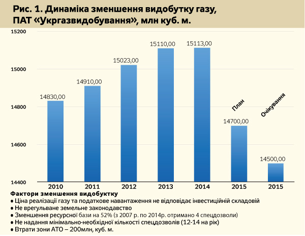 Жалюгідний стан фінансів безпосередньо позначається на оперативній діяльності "Укргазвидобування". Особливо помітні проблеми на ключовому напрямку - видобутку газу та конденсату. Третій квартал 2015-го став найгіршим за всю історію існування компанії, темпи падіння досягли 5–6% на місяць. Усього з початку року компанія втратила 0,5 млрд кубометрів газу порівняно з минулим роком.