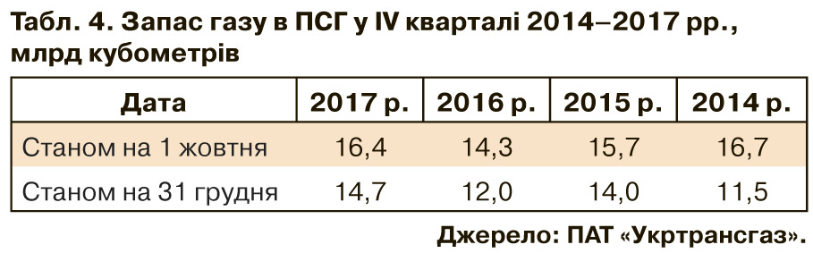 На запитання DT.UA, скільки газу в українських ПСГ було на початку нинішнього опалювального сезону й скільки залишилося наприкінці 2017-го порівняно з попередніми роками/періодами, прес-служба "Укртрансгазу" повідомила, що станом на 31 грудня 2017 р. у підземних сховищах знаходилося 14,7 млрд кубометрів (на 31 грудня 2016 р -12 млрд кубометрів).