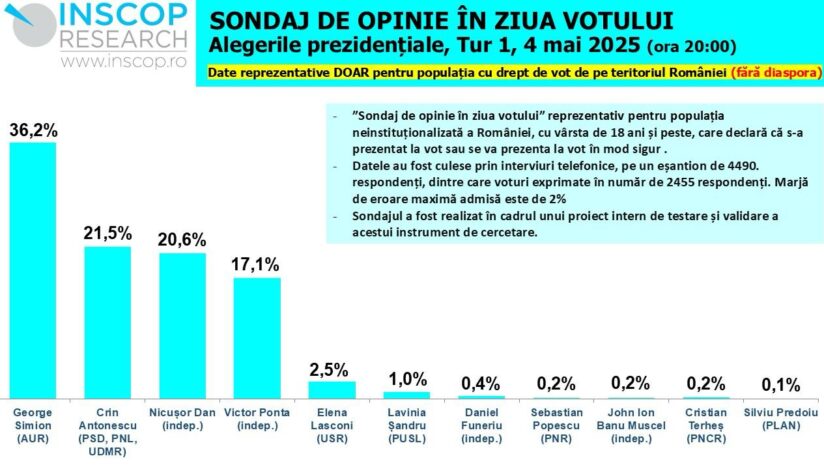 У неділю, 4 травня, в Румунії відбуваються на повторні президентські вибори. Згідно з результатами екзитполів, на виборах лідирує лідер ультраправого «Альянсу за об'єднання румунів» Джордже Сіміон. Результати екзитполів, які провів INSCOP, опублікував мовник TVR.