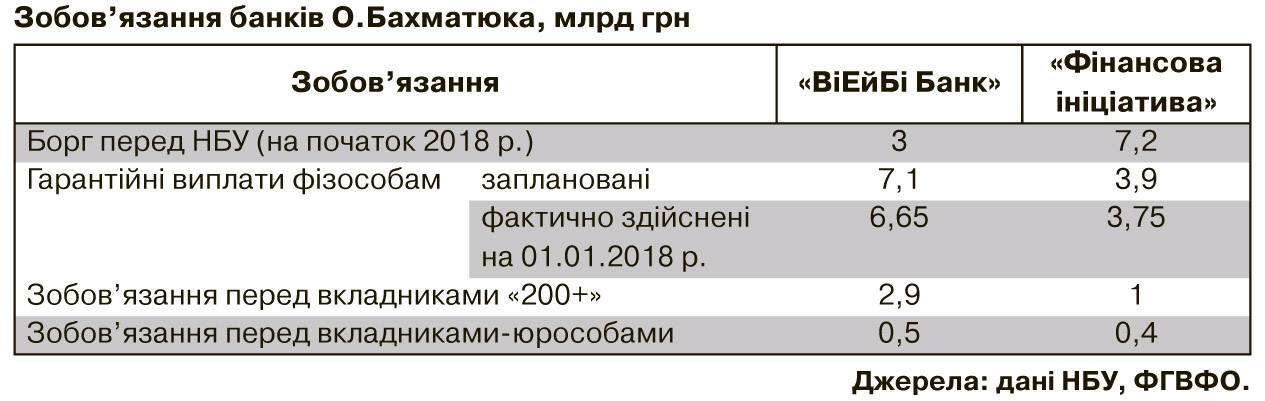 У заявах Бахматюка йдеться про 19 млрд грн зобов'язань перед Фондом гарантування вкладів. Куди, очевидно, він включає залишок заборгованості за рефінансуванням НБУ та виплачену ФГВФО суму компенсацій за вкладами (за мінусом уже виплаченого, за словами Бахматюка, 1 млрд грн - див. табл.). З Фондом гарантування, як також уже неодноразово наголошував агробарон, він веде "активний діалог".