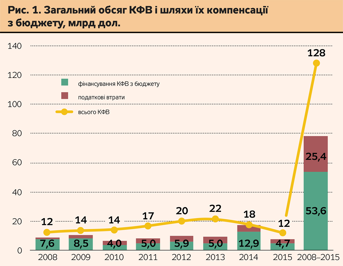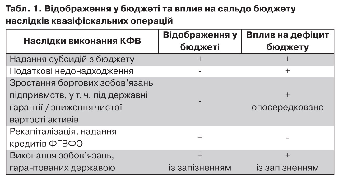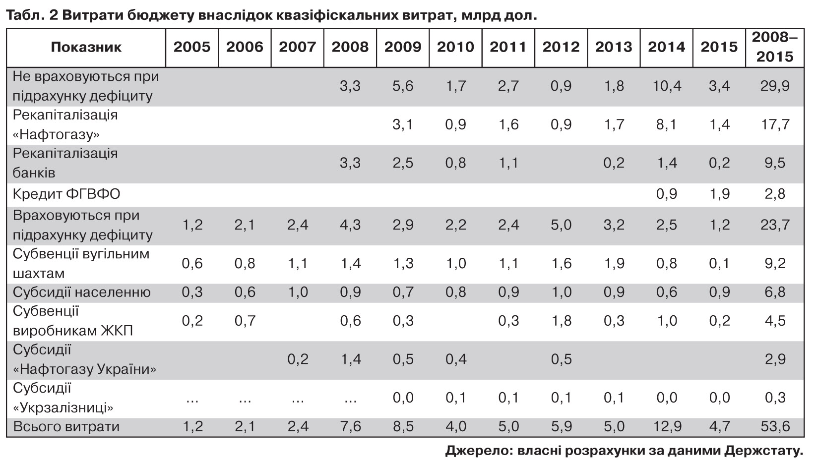 Як видно з рис. 1,за 2008–2015 рр. обсяг квазіфіскальних втрат в Україні становив 128 млрд дол. США (!), з них 79 млрд (62%) покрито за рахунок держбюджету. Зокрема прямі втрати податкових надходжень дорівнювали 25,4 млрд у доларовому еквіваленті, а витрати державного бюджету - 53,6 млрд. Зазначені витрати здійснювалися у формі придбання акцій "Нафтогазу України", банків, а також надання кредитів ФГВФО і не враховувалися при підрахунку дефіциту бюджету - 29,9 млрд дол., а також у формі субсидій і субвенцій, які відносяться до видатків і відповідно впливали на дефіцит бюджету, - 23,7 млрд дол. (табл. 2).