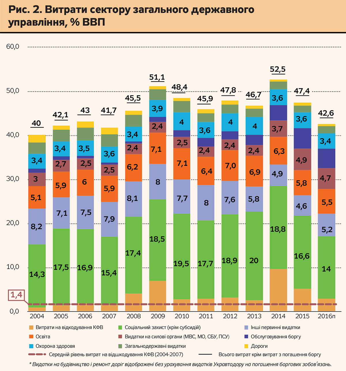 Що ж призвело до такого різкого зростання державного боргу? На рис. 2 відображено витрати сектору загального державного управління. Протягом 2004–2007 рр. не пов'язані із погашенням боргу витрати перебували на рівні 41,7% ВВП. Під час кризових явищ витрати бюджету різко збільшилися - з 45,5% у 2008 р. до 52,5 % у 2014-му.