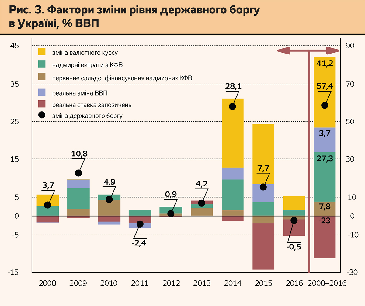 Зазначені надмірні витрати фінансувалися здебільшого за рахунок боргових запозичень. Як показано на рис. 2, основними факторами збільшення держборгу упродовж 2008–2016 рр. стали зростання валютного курсу - на 41,2% ВВП, а також надмірні витрати, пов'язані з КФВ (прямий вплив), - 27,3% ВВП. Крім того, існує й опосередкований вплив боргових потоків на фінансування надмірних КФВ, який враховується в показнику автоматичних факторів: вплив валютного курсу, вплив зміни реального ВВП, вплив реальної ставки запозичень.
