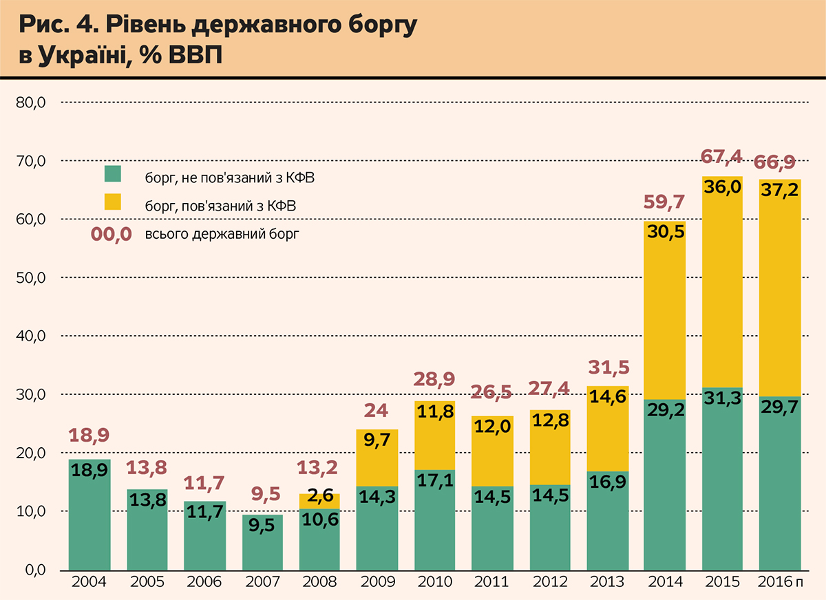 З початку кризових явищ в економіці рівень державного боргу збільшився з 9,5% ВВП у 2007 р. до 67,4% ВВП - у 2015-му (найвищий показник з моменту здобуття незалежності). Особливо помітно підвищився рівень державного боргу за останні три роки - на 40% ВВП.