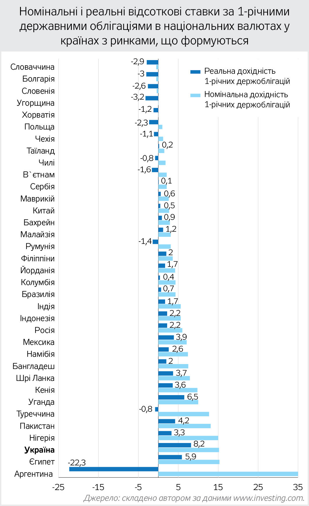 (15,2% річних) Україну випереджають лише Єгипет (15,3%) і Аргентина (35). Для порівняння: у Болгарії, Словаччині, Угорщині та Словенії номінальні ставки мають від'ємні значення, а в Хорватії, Чехії, Польщі, Чилі та Таїланді - не перевищують 2% річних. У Марокко, Китаї, Сербії, Чилі, Малайзії, Філіппінах, Румунії, В'єтнамі номінальні ставки перебувають у діапазоні 2–4% річних.