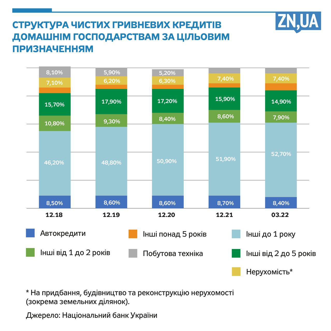 Насправді, попри всілякі пільгові іпотеки від уряду, ані кредити на нерухомість, ані автокредити не становлять значної частки у кредитних портфелях банків (див. рис.). Кредитування у цих сегментах розвивалося мляво, а з початком війни, що зрозуміло, зовсім зупинилося.
